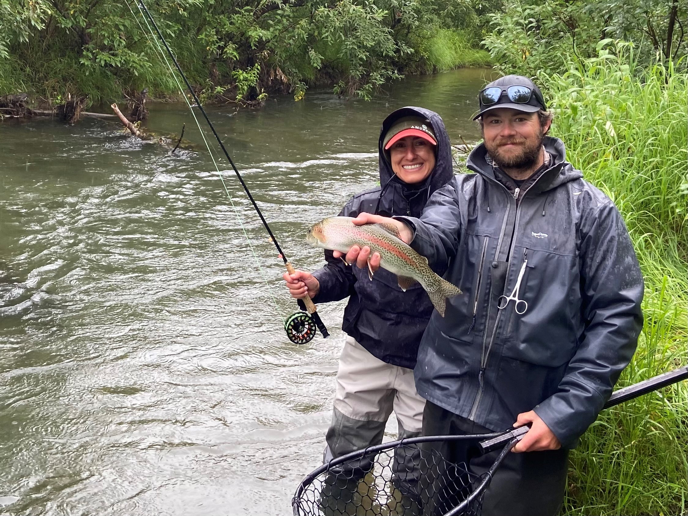 Guide Jacob with Natalie and a nice Rainbow Trout from a small tributary