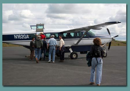 Our pilot (far left) greets us as we board his plane for the flight to Quinhagak. Grant Aviation was very professional, but very laid back and personabl